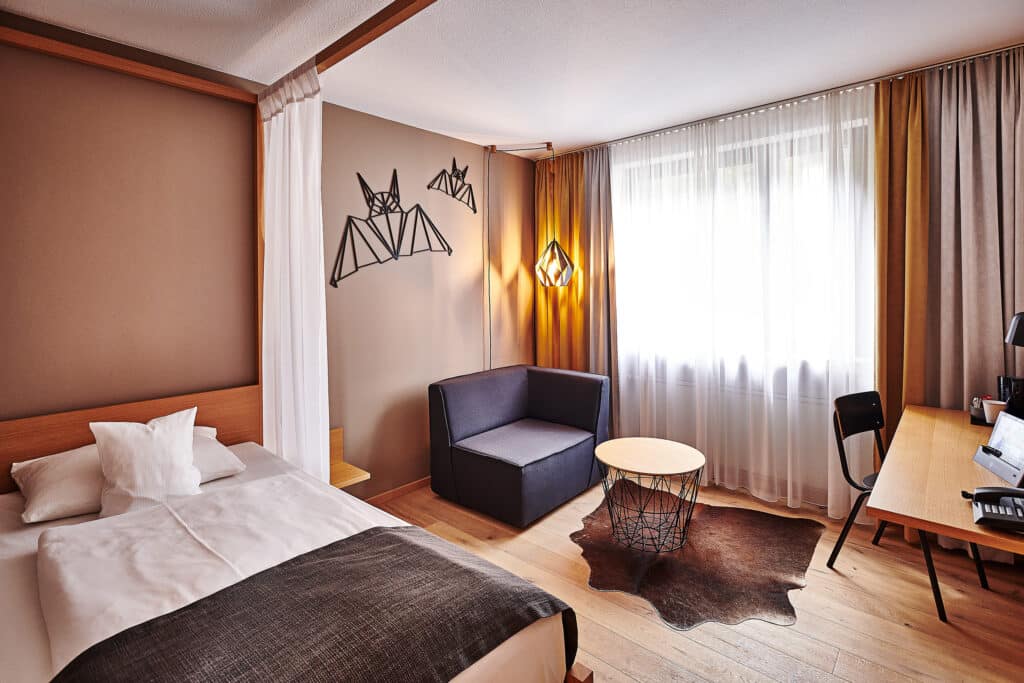 Größe ist nicht alles. Das Design unserer Themenzimmer im etwas kleineren Format. Wohnen wie ein Wäller – so nennt man die Menschen, die im Westerwald leben. Und das auf etwas weniger Fläche. Nach einem ereignisreichen Tag sorgt das Einzelbett (1,00 x 2,00m) für entspannte Nächte. Die modernen Zimmer sind mit Eichenholzparkett, einer gemütlichen Sitzecke, einer Minibar und augenzwinkernder Deko ausgestattet.